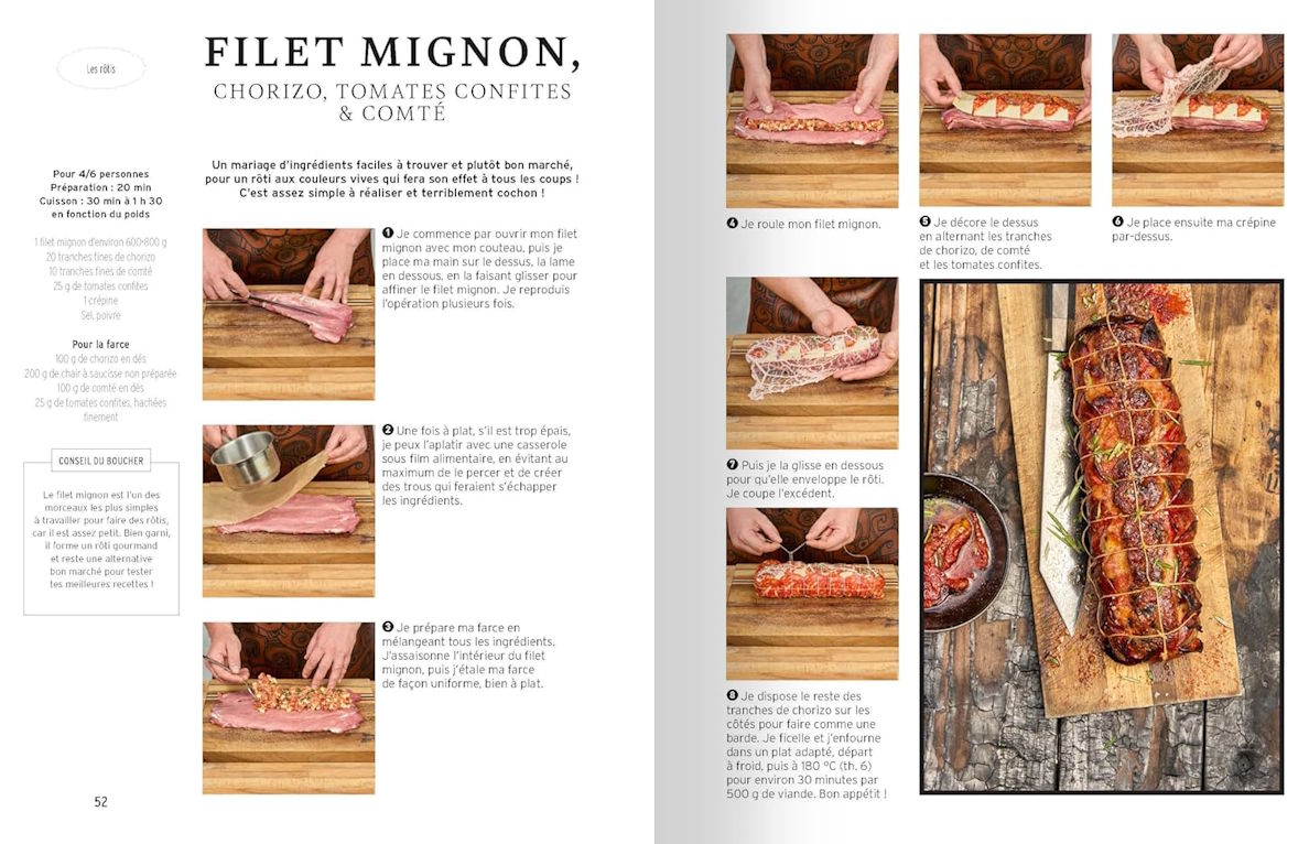 Detailed, illustrated tutorials show how to handle classic preparations step by step: tying a roast with even tension, wrapping caul fat around chicken thighs, or filling and securing boneless poultry. The recipes that follow are deeply traditional, with combinations that feel generous rather than flashy: veal stew with olives, pork cheek confit, boneless chickens stuffed with pear and gorgonzola, lamb shoulder roasted with parsley butter.