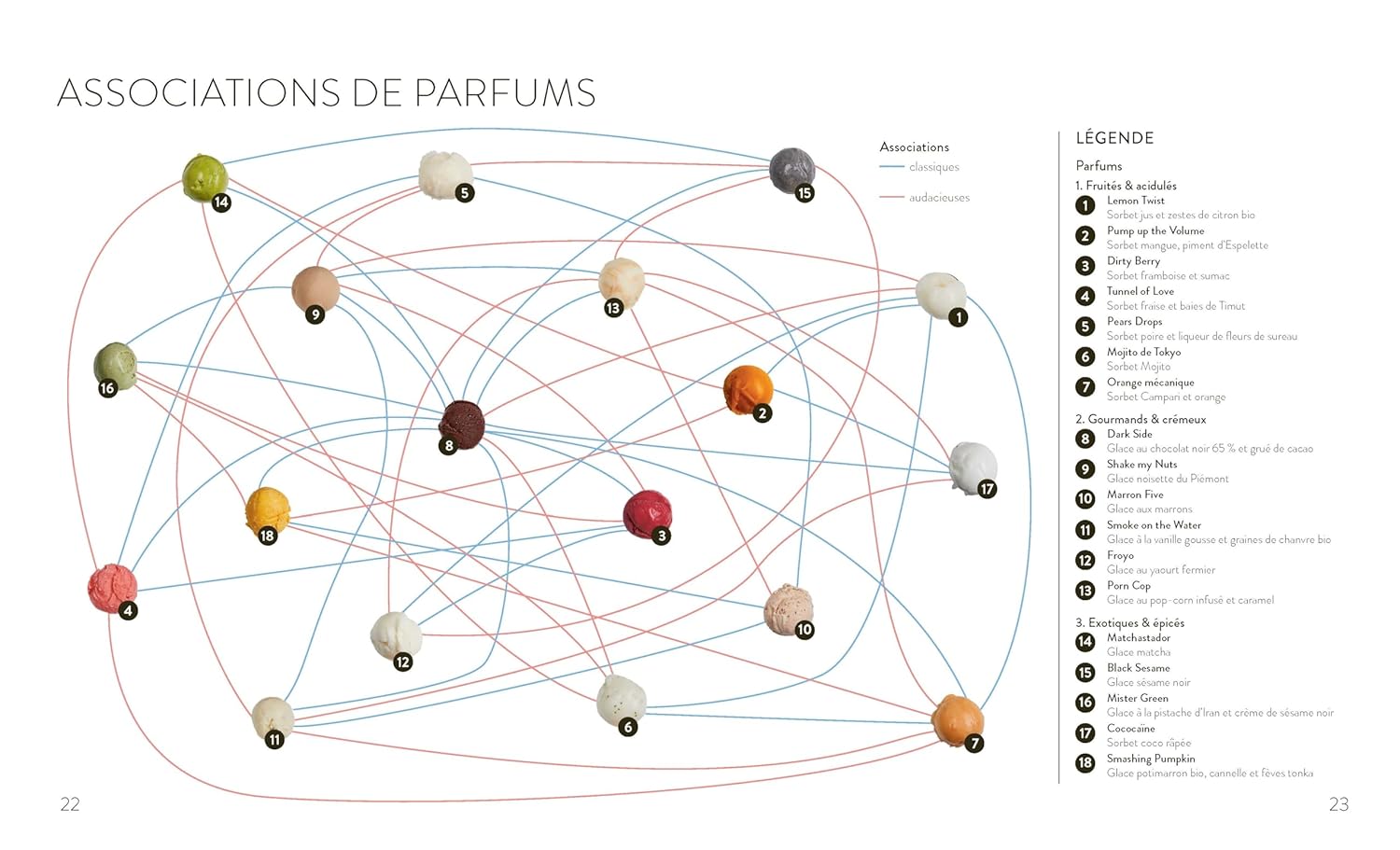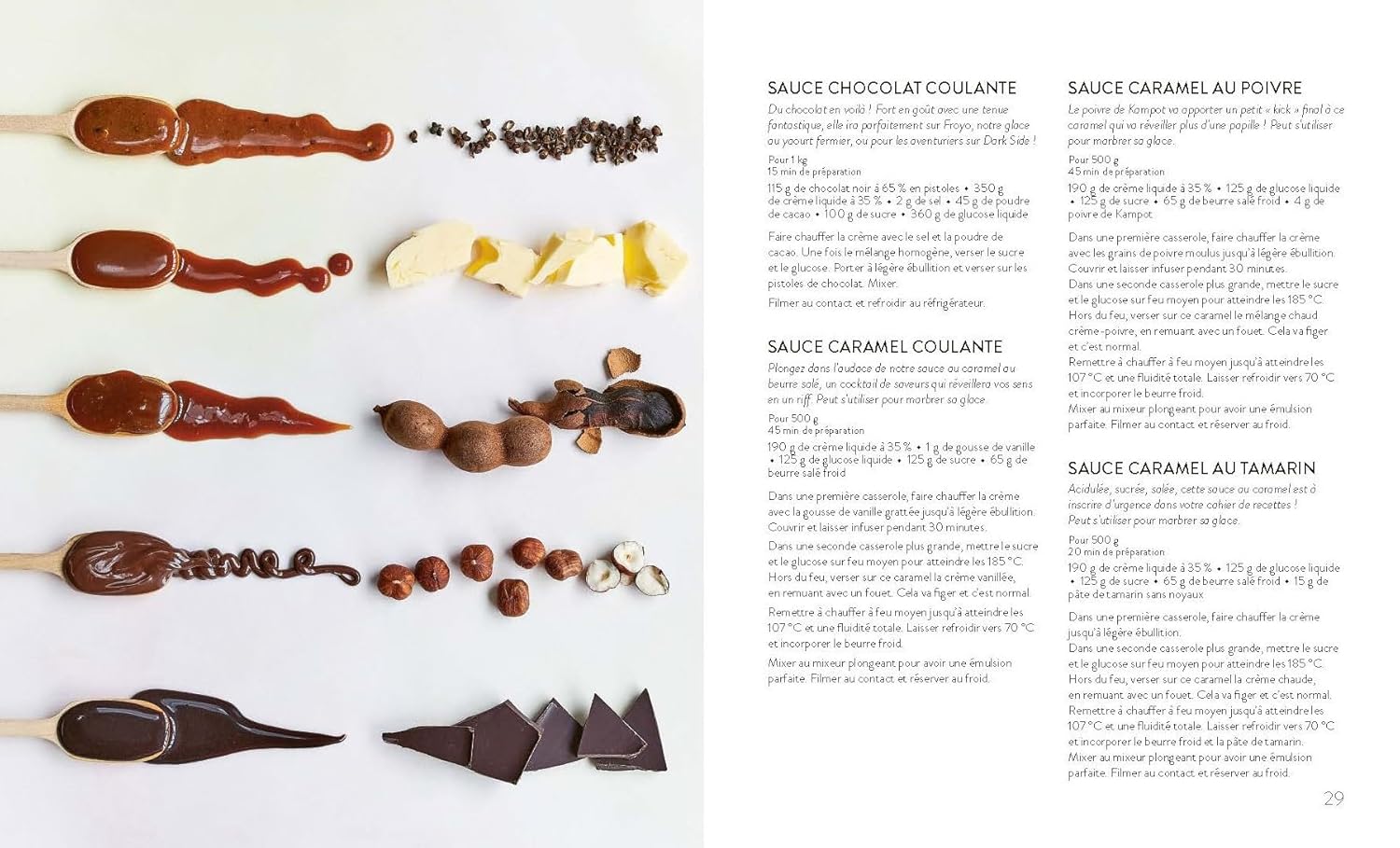 Inside are nearly 60 recipes for ice creams, plant-based alternatives, sorbets, and imaginative plated desserts with names to match their flair. You’ll find classics turned inside-out (like an omelette norvégienne with mandarin sorbet and Italian meringue) and rule-breaking inventions like an ice cream pizza topped with nduja and finished with arugula.