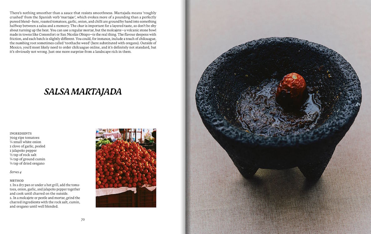 The recipes come largely from the Sazón cookery school at  the Belmond hotel chain's Casa de Sierra Nevada, alongside dishes from noted chefs such as Enrique Olvera and Daniela Soto-Innes. Expect accessible cooking with distinctive touches: pico de gallo brightened by xoconostle (a tart cactus fruit), grilled corn enriched with bone marrow, and ceremonial tortillas pressed with decorative stamps and cooked over open flame.