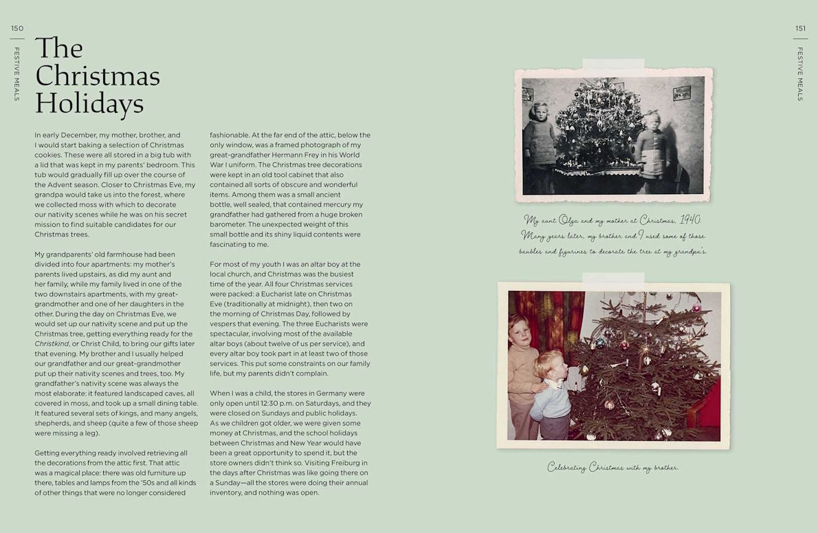 Alongside classic cookies like walnut-coffee crescents and yogurt stollen, the book includes recipes for spätzle with cheese and onion, chicken in white wine sauce, and smoked pork wrapped in bread dough. There are suggested menus for Christmas Eve meals—when German families traditionally gather to exchange gifts—and a final chapter with treats from Christmas markets, like roasted almonds and mulled wine.