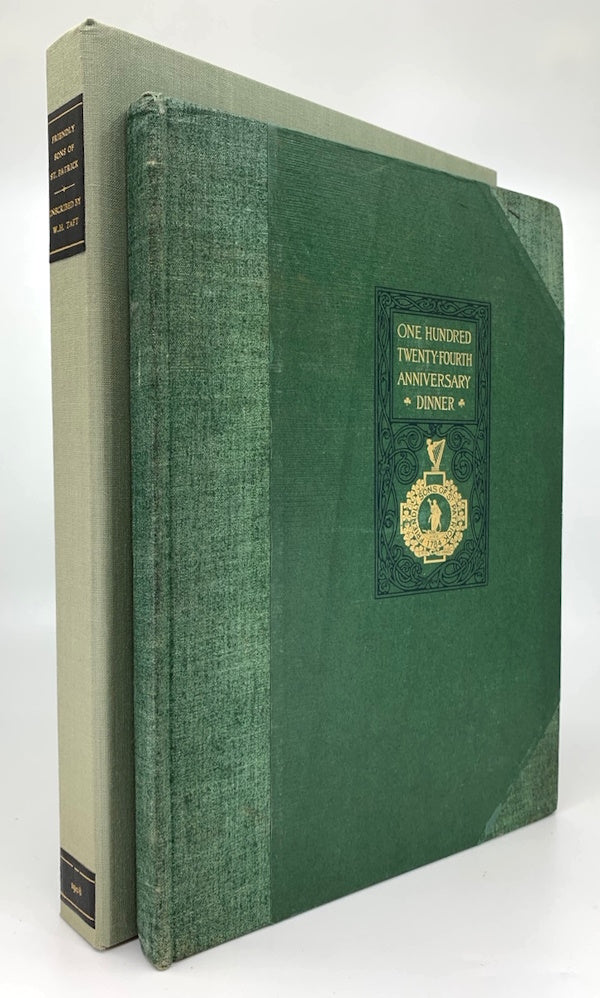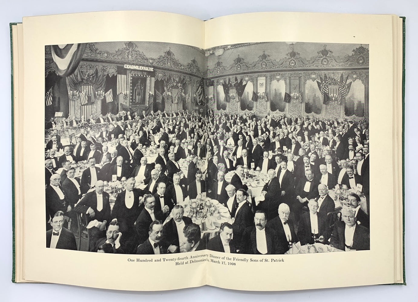 An invitation to the Society’s annual anniversary dinner (held on St. Patrick’s Day, of course) is both coveted and prestigious. For many years, the organization published luxurious yearbooks after the dinner with the menu, transcripts, and music. We offer here the 1908, 124th anniversary book, the dinner for which was held at the Delmonico’s (a frequent selection—at the restaurant’s many locations—over the years) on 5th Ave and 44th St.