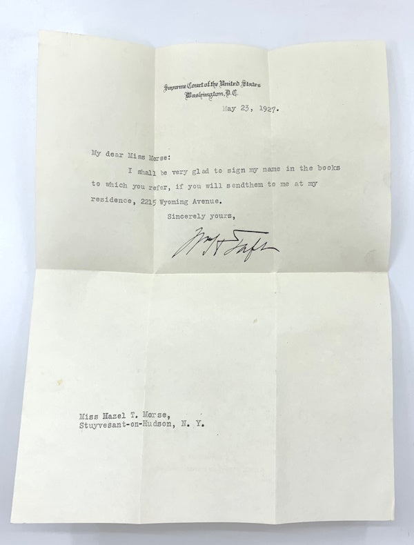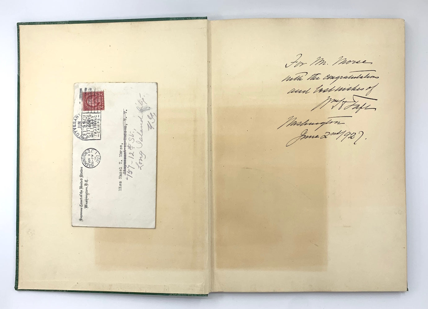 Affixed to the front pastedown, on US Supreme Court stationery, is a letter and envelope addressed to Morse who had apparently written to Taft, many years after the dinner and the book’s publication, asking if he might sign her copy. The letter here is his affirmative reply, asking her to send the book to his residence. It is also signed by Taft. (Taft had become US Supreme Court Chief Justice in 1921.)