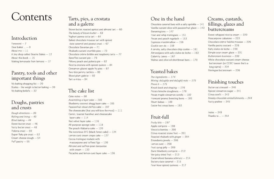 The recipes are divided across eight chapters: Doughs, pastries & crusts; Tarts, pies, a crostata & a galette; The cake list; One in the hand; Yeasted bakes; Fruit-full; Creams, custards, fillings, glazes and buttercreams; and Finishing touches.